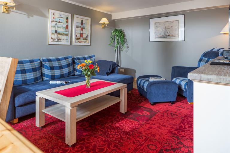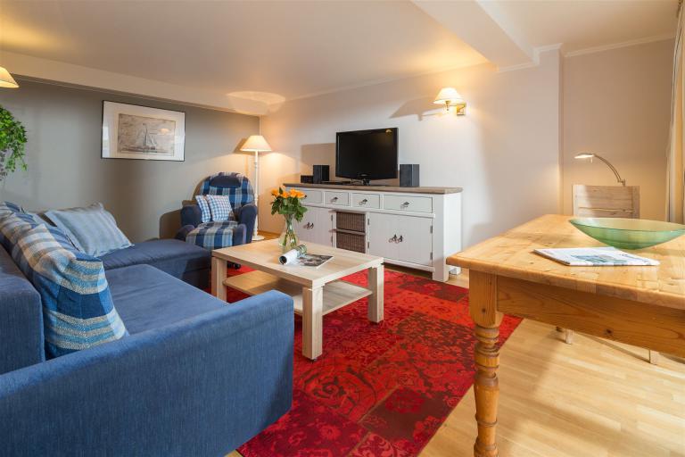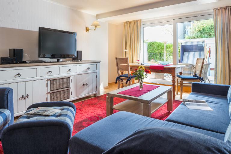 Sie ist hochwertig eingerichtet und lässt keine Wünsche offen. Die 2 separaten Schlafzimmer verfügen über ein Doppelbett, sowie ein komfortables Etagenbett. Besonders schön ist die Terrasse mit Strandkorb, die sie von der Küche und vom Wohnzimmer durch eine große Schiebetür begehen können. Die Wohnung verfügt über ein Duschbad.