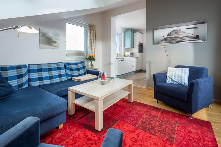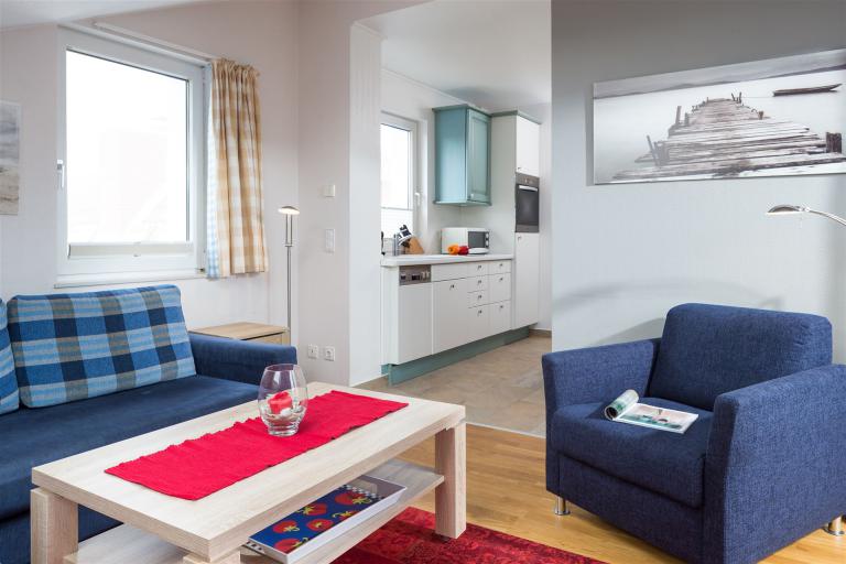 Im Wohnbereich mit Küchenzeile befindet sich ein komfortables Sofa. Von hier aus gelangen Sie auf eine der beiden Terrassen. Das Schlafzimmer mit Zugang zur 2. Terrasse verfügt über ein Doppelbett. Das Apartment hat ein Duschbad.